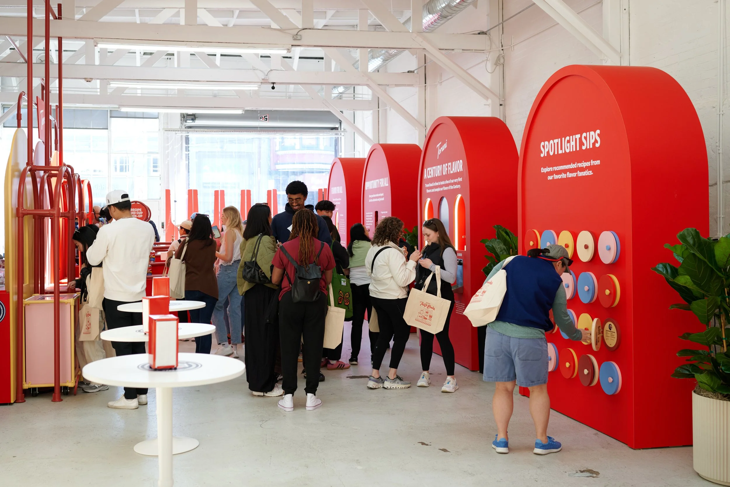 Playful details like a conveyor belt with "flavor domes," selfie-friendly Torani mirrors, and a PVC curtain entrance transformed the space into a Wonka-esque, candy-colored wonderland, bringing Torani's personality to life.